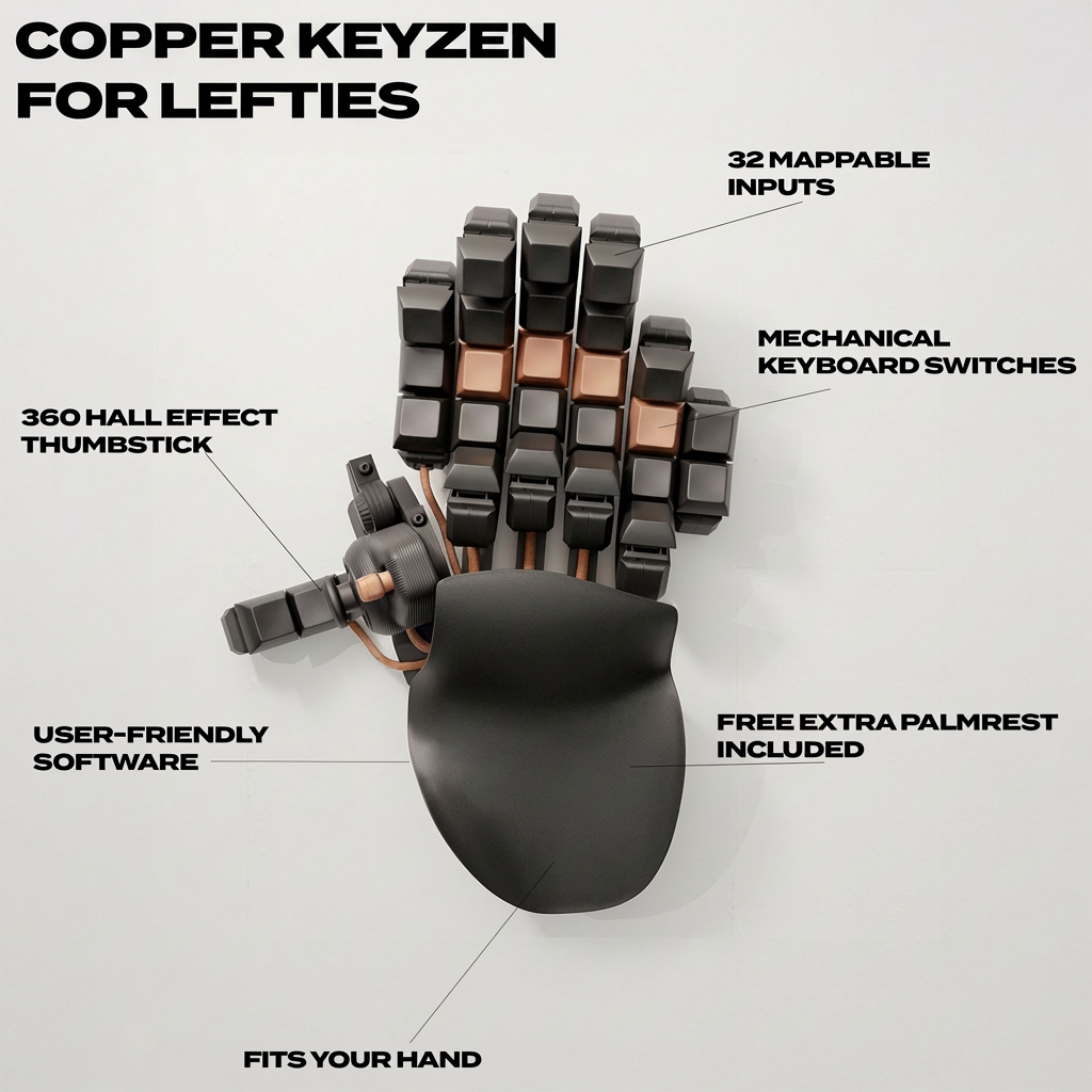 • Keyzen: Cherry MX mechanical switches (Red/Blue/Brown), 32 programmable inputs, DSA keycaps, 2–4 mm key travel, 45–60 g actuation — ideal if you already love mechanical keyboards.
