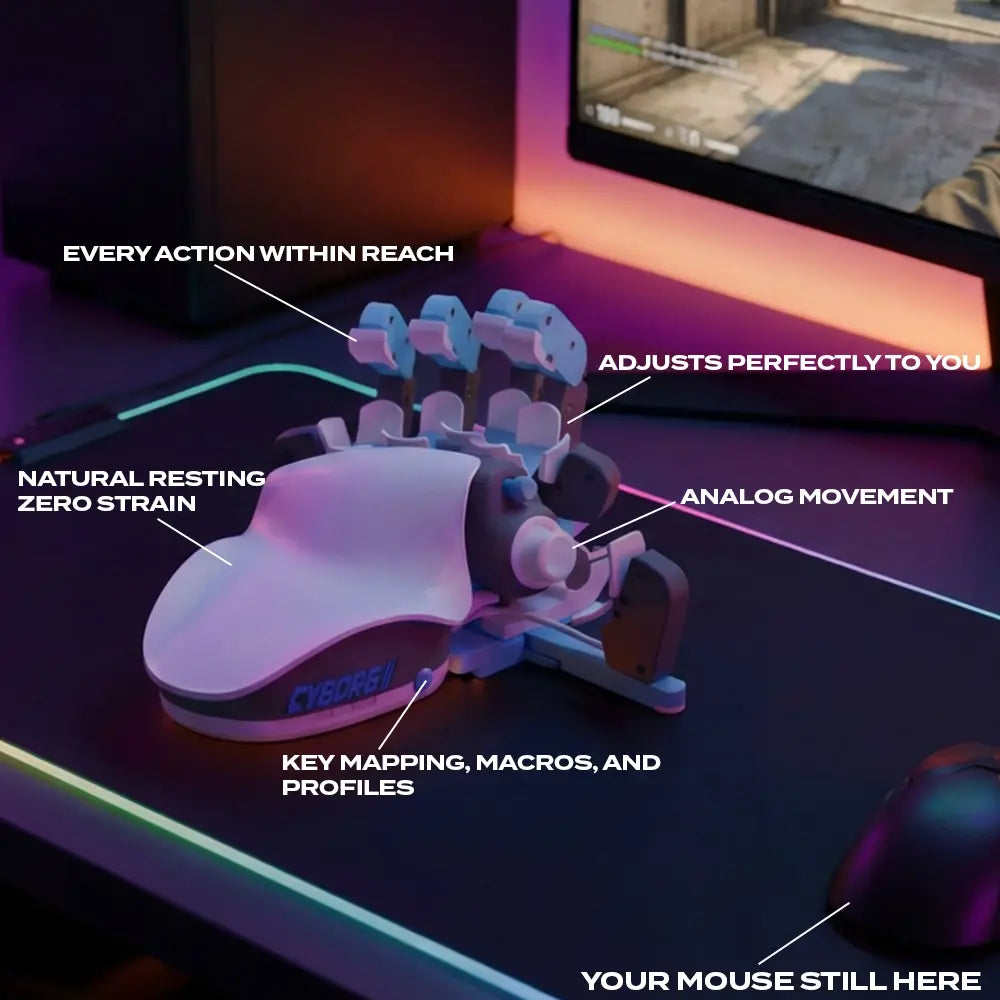 Keyboards are designed for typing, not for hours of gaming. The Cyborg II adjusts to your hand at every angle, every finger position, so you can play longer without the strain.